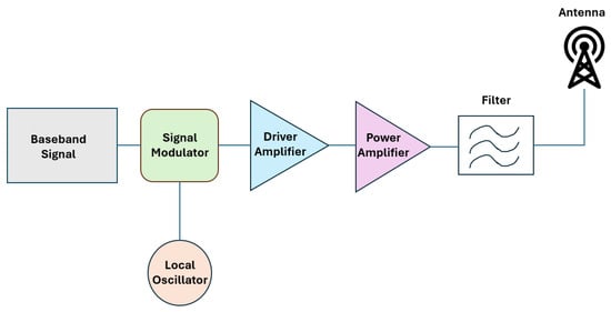 In a conventional transmitting chain, the baseband signal, carrying the required data, is generated and then modulated onto a carrier frequency from an oscillator, typically employing modulation schemes such as Quadrature Amplitude Modulation (QAM), Phase Shift Keying (PSK), or Frequency Shift Keying (FSK), depending on the communication system’s requirements and performance objectives. This modulation step produces a modulated signal ready for amplification [5,6]. The signal subsequently traverses multiple amplification stages, including a driver amplifier and the power amplifier (PA), which ultimately provides the necessary power level for transmission [1,7,8]. Before reaching the antenna, the signal is filtered to remove unwanted spectral components, ensuring efficient and dependable communication [9]. This sequence, as depicted in Figure 1, is fundamental for maintaining signal integrity and energy efficiency, particularly as modern communication systems push towards higher frequencies and stricter performance standards [10,11,12].