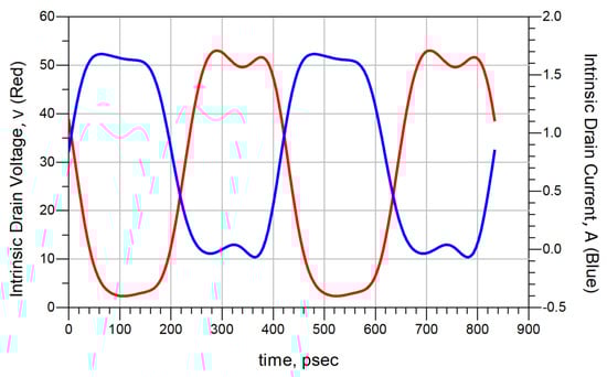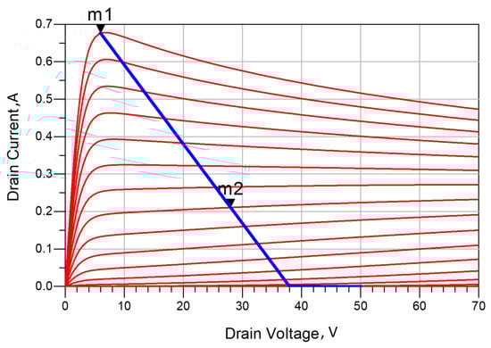 Figure 3 displays the load-line analysis superimposed on the - characteristics of the GaN HEMT. The red curves represent the device’s output characteristics for various gate–source voltage values, while the blue line indicates the load line, intersecting key points and , corresponding to the saturation and cut-off regions, respectively. The intersection at represents the maximum allowable current at a low , while indicates the maximum at a minimal .