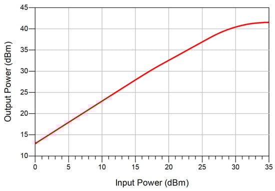 Key performance metrics for the designed PA include large-signal gain, compression points, power-added efficiency (PAE), drain efficiency, return loss, and stability response, each thoroughly evaluated across a range of input powers and frequencies. The large-signal gain maintained approximately 13 dB up to the 1 dB compression point at , with the 3 dB compression point occurring at . These compression points are critical in defining the PA’s linear operating range, confirming its suitability for applications demanding high linearity and low distortion. Additionally, the output power analysis demonstrated that the amplifier could achieve up to 40 dBm at the 3 dB compression point, further validating its capacity for high-output applications.