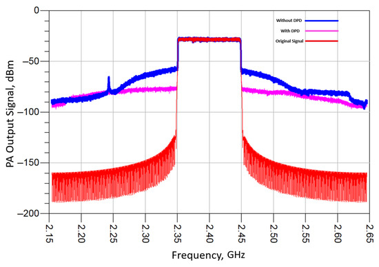 The blue trace in Figure 10 corresponds to the PA output without any pre-distortion applied. Under these conditions, the signal undergoes significant spectral regrowth, characterized by elevated power levels in adjacent channel regions. This regrowth originates from the intrinsic non-linearities of the PA, particularly when operating near its saturation point, where gain compression, AM-AM, and AM-PM distortion mechanisms become prominent. These effects result in the generation of higher-order intermodulation products, which fall outside the main signal band and degrade the adjacent channel leakage ratio (ACLR). Additionally, memory effects—arising from thermal feedback, charge trapping, or frequency-dependent impedance—may exacerbate distortion and spectral widening, especially under wideband or bursty signal conditions.