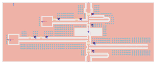 The electromagnetic (EM) co-simulated layout of the PA is shown in Figure 11. This layout considers parasitic effects that arise from the physical layout, including inductances and capacitances from interconnects, which can impact the amplifier’s performance at high frequencies. EM co-simulation ensures that the layout adheres to the design specifications and mitigates potential degradation in gain, efficiency, and stability due to parasitic elements.