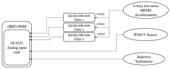 The data were collected using a system comprising a three-axial MEMS accelerometer, three KEMO filters, an inductive tachometer, a wind speed and direction sensor, and a data acquisition unit. The data acquisition unit, depicted schematically in Figure 2, was mounted within the turbine’s nacelle housing.