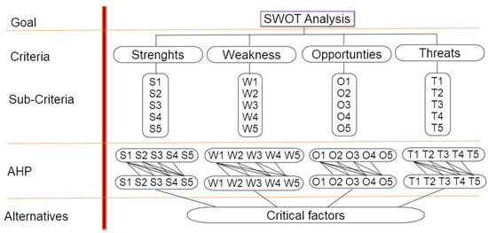 In the final phase, the overall priority vector is calculated by multiplying the local weightings of the factors by the specific group weighting to determine the priority ranking of the SWOT factors.