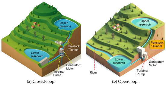 The PSH is a reversible mechanical energy storage system that uses the difference in height between two water reservoirs to convert the potential and kinetic energy of the water into electricity [29]. Worldwide, the PSH is one of the most cost-effective ways to store large amounts of energy in the long term [30]. In addition, due to its flexibility and generation capacity, it offers great potential for providing ancillary services and balancing power generation from a range of different energy sources [31]. There are various configurations of PSHs, the most common of which are open and closed systems, as shown in Figure 2.