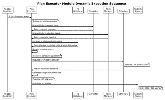 The Plan Executor manages the complete scheduling lifecycle through a sequence of coordinated operations: (1) triggering reschedules based on system feedback, time periods, or operator intervention, (2) coordinating with the simulator to obtain updated contact windows, (3) interfacing with the Task Manager to generate initial task lists incorporating failed tasks and remaining assignments from previous schedules, (4) updating satellite resource states using telemetry feedback, (5) invoking the scheduler optimization process, and (6) distributing the resulting plans to respective system agents. The execution diagram is illustrated in Figure 2.