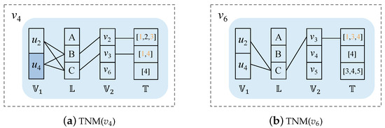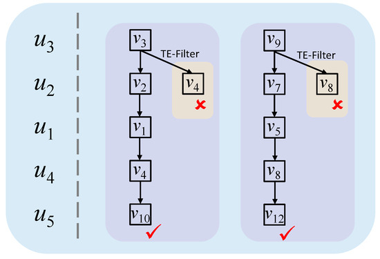 - : First, for each vertex , add an edge between w and its time set in if passes through the check; then, add an edge between w and its label if w is connected with a time set; then, for each vertex and its neighbors’ label , add an edge if L has at least τ neighbors in , where τ is the number of neighbors of u with label L in the query graph.