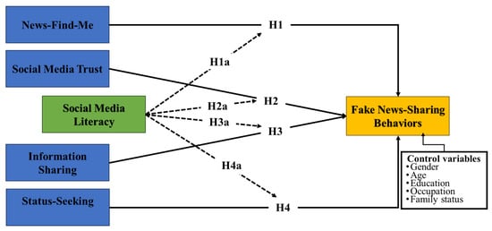 Nevertheless, social media literacy extends beyond simply identifying fake news; it equips users to critically evaluate both content and sources, a crucial skill given social media’s role as a breeding ground for misinformation [99]. Such literacy cultivates responsible online engagement [100] and develops critical content evaluation skills, with studies demonstrating significantly reduced misinformation sharing among literate users. Research shows that individuals with stronger literacy skills have a lower propensity to trust and share fake news [101]. Importantly, research points to educational investment as the most sustainable and comprehensive economic and social policy for combating fake news dissemination [102]. Results by Wei, Gong [28] supported this statement, showing that social media literacy significantly moderates the influence of factors like news-find-me perception, social media trust, and information sharing on fake news sharing behavior. Thus, we draw on the above insights to formulate the following moderating effect of social media literacy: