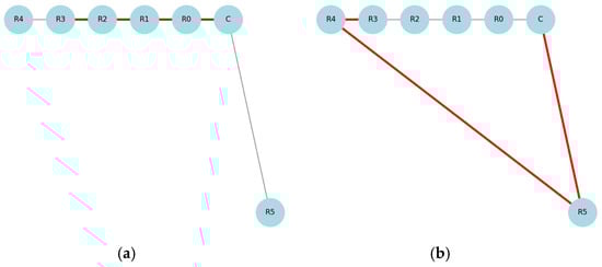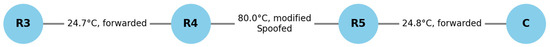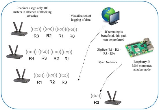 Each node was labeled with its identifier (e.g., R1) and a temporary card containing a brief description. The Zigbee network was formed automatically using a shared PAN ID. The initial network setup was performed via the coordinator node, which managed the registration of nodes and their routing paths. Prior to launching the attack, the network topology was designed to follow a strict linear configuration using XCTU to ensure predictability and control in routing behavior.