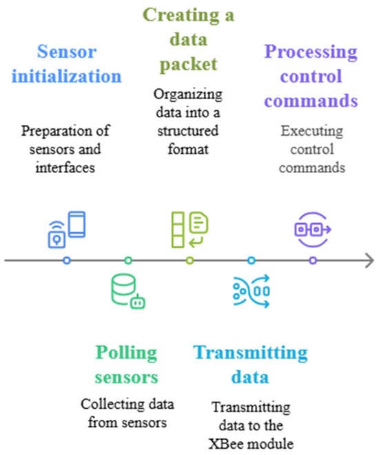 A key element of the system’s functionality is the firmware developed for the Arduino-based WSN nodes. These nodes are responsible for real-time data collection from various sensors and wireless communication via the Zigbee protocol using XBEE modules. The software requirements included reliability, energy efficiency, scalability, and compatibility with selected hardware components. As shown in Figure 18, each node’s firmware is composed of several logical modules that collectively ensure smooth operation within the wireless sensor network.