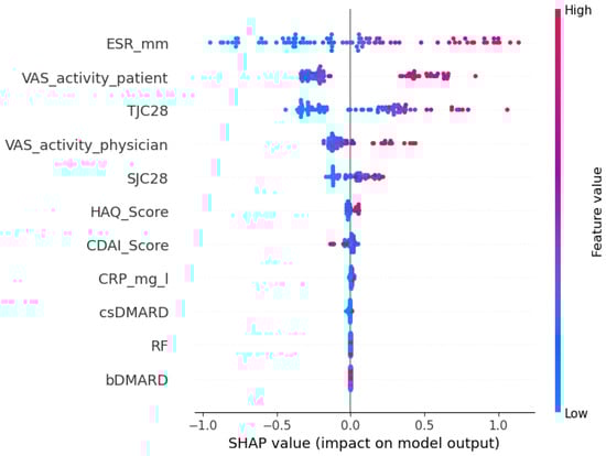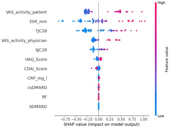 - Salehi, F.; Salin, E.; Smarr, B.; Bayat, S.; Kleyer, A.; Schett, G.; Fritsch-Stork, R.; Eskofier, B.M. A robust machine learning approach to predicting remission and stratifying risk in rheumatoid arthritis patients treated with bDMARDs. Sci. Rep. 2025, 15, 23960. [Google Scholar] [CrossRef]
