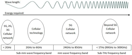 mmWave technology is a foundational component of 5G, operating in the 24–100 GHz frequency range [50,51]. These high-frequency bands enable ultra-fast data rates and broad bandwidth, making mmWave ideal for data-intensive applications like UHD video streaming, AR, and VR. However, the short wavelengths of mmWave result in limited range and poor penetration through obstacles. To address this, 5G networks utilize dense small cell deployments and beamforming to focus signals and enhance both coverage and reliability.