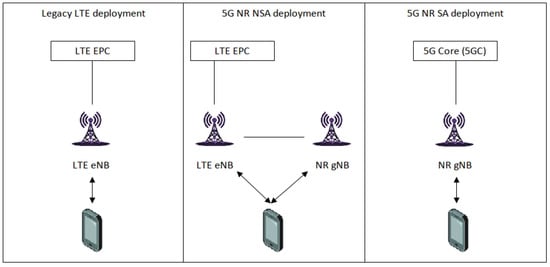 The use of massive MIMO, beamforming, and other advanced radio access technologies boosts spectral efficiency and coverage, especially in dense environments [37]. Deployment models include Non-Standalone (NSA), which relies on LTE-A for control functions, and Standalone (SA), which uses a dedicated 5G core for both control and data planes—delivering enhanced throughput and capacity [37]. Figure 2 illustrates the core components and interfaces of 5G systems.