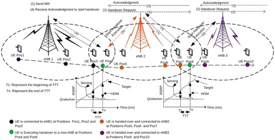 For 5G HetNet to maintain the quality of the network connection between the serving and target cells, the HCPs are essential for controlling and optimizing the HO process. In order to ensure continuous connectivity with the best cellular network available, HCPs can control when and how a UE must execute a HO. Three often-used HCPs in the context of 5G HetNet are Cell Individual Offset (CIO), TTT, and HO margin (HOM). These HCPs are essential to maintaining the quality of UE connections. The difference in RSS or signal quality between the current cell and the intended cell for HO is shown by HOM, which stands for HOM and is measured in decibels (dB). To avoid HO that occurs too late, it is preferable to have a lower HOM in high-speed scenarios. On the other hand, a higher HOM is more suited in low-speed settings to avoid HO occurring too soon. Because it directly affects HO performance, the HOM is an essential component of 5G HetNet. In contrast to previous generations, 5G requires lower settings to achieve its high-speed and low-latency requirements. To attain equilibrium among the HO rate, HOFR, and HO interruption time, HOM should also be adjusted. TTT is the amount of time that a UE must stay below the trigger threshold in order for a HO to be started. In 5G HetNets, the TTT parameter significantly affects both the overall QoS and HO performance. Although a shorter TTT can improve user experience and HO rate, it can also raise HOFR. A longer TTT, on the other hand, can lower the HO rate, but it might have a detrimental effect on the user experience and QoS. The specific use case and network requirements should be carefully taken into account when determining the ideal value for TTT [21].