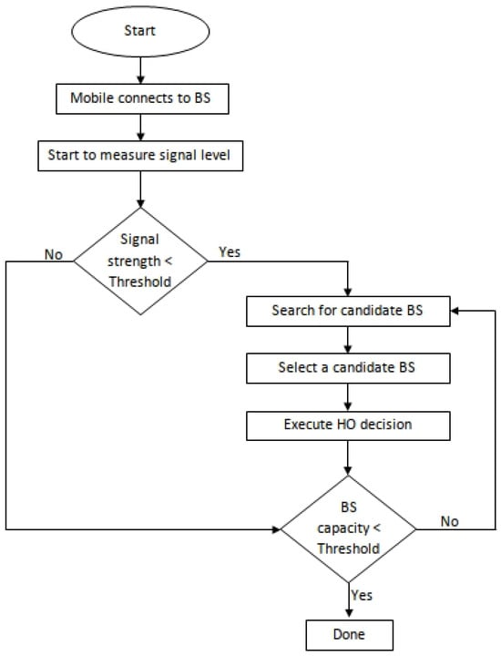 HO is the seamless transition of a UE from one cell’s coverage to another one without losing connection (interruption). Efficient and punctual HO within any communication network is crucial for uninterrupted communication. Within the context of wireless communication systems, HO can be primarily classified into two categories: Hard HO (H-HO) and Soft HO (S-HO), often referred to as break-before-make and make-before-break HO, respectively. During the H-HO procedure, the UE promptly disconnects from the current cell (serving cell) and establishes a connection with the new cell (target cell) without any interruptions. On the other hand, the S-HO method entails creating a fresh connection to the next cell prior to ending the current connection [2,12]. Additionally, Horizontal handover (HHO) and Vertical Handover (VHO) are alternative forms of HO. The HHO procedure involves the HO of a UE from one cell to another inside the same network, utilizing the same frequency. VHO facilitates smooth UE movement across diverse networks. HHO refers to HO occurring between homogeneous BSs, while VHO refers to HO happening between HetNet BSs [2,21]. Because the deployment scenarios of many RATs, including mmWave and Sub-6 GHz, overlap, the HO process in 5G HetNet is carried out via VHO. Figure 3 presents mobility management with HO initiation.