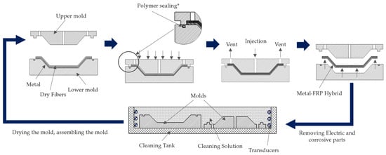 Figure 1 illustrates the complete RTM production cycle, highlighting the integration of cleaning after a predefined number of production cycles. In the conventional approach, this involves fully dismantling the mold from the press, performing an external cleaning process, reassembling the tool, and then resuming production. To address these challenges, this work introduces a localized ultrasonic cleaning method designed for in situ use within RTM mold tools.