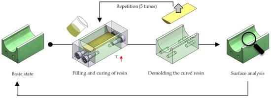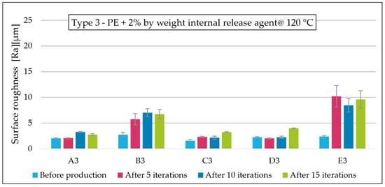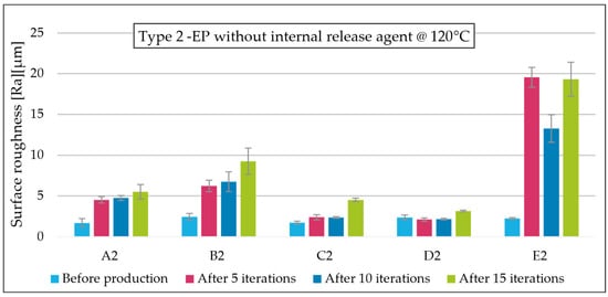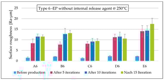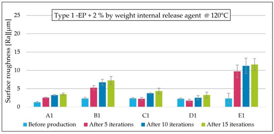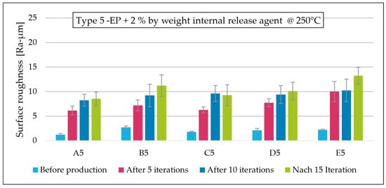a increase (678%) of the entire dataset. E5 also reached a high value of 13.25 µm, confirming that even release agent application cannot prevent thermal fouling in enclosed and drilled geometries. This highlights the cumulative effect of thermal exposure, cavity shape, and chemical protection on surface roughness progression. In addition, according to the material datasheet, exposure to 250 °C induces degradation and post-curing effects in thermoset epoxies, including excessive viscosity reduction, breakdown of adhesion promoters, and possible surface oxidation, all of which diminish interfacial bonding and contribute to easier resin detachment during demolding.