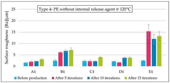Figure 9, the polyester without release agent (Type 4) showed greater roughness growth than Type 3, but still remained less aggressive than the epoxy. Notably, E4 increased from 2.51 µm to 13.27 µm (a 428% increase), indicating that even polyester systems can lead to critical contamination in high-risk zones if no release agent is used. In contrast, geometries like C4 and D4 stayed below 4.0 µm, reinforcing that open contours and sealing regions are more manageable under controlled flow.