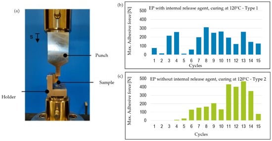 a was measured at five predefined surface positions after cycles 0, 5, 10, and 15. The influence of both resin type and the use of internal release agents were evaluated. At 120 °C, four material configurations were tested, combining epoxy and polyester systems with and without internal release agents. For the higher-temperature study at 250 °C, only epoxy-based systems were examined, based on their stronger tendency to accumulate surface contamination observed in the earlier phase.
