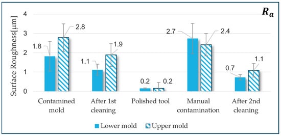 Figure 13. It is also evident that the surface roughness measured directly on the RTM tool remained lower than those observed in the earlier insert-based trials, indicating that large-scale cavity surfaces may accumulate contamination less aggressively than localized or complex geometries. Initial contamination levels were higher on the upper mold half (2.8 µm) compared to the lower mold half (1.8 µm), likely due to reduced contact with cleaning fluid in upward-facing areas and greater exposure to evaporative loss. After the first cleaning iteration using a citric acid–acetone solution with continuous ultrasonic activation, roughness decreased to 1.1 µm on the lower mold and 1.9 µm on the upper mold. Although both surfaces showed improvement, the difference highlighted the need for better solution coverage and vapor control in the upper cavity region.