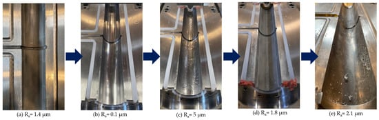 a values between 3.5 µm and 11.6 µm. The most stable geometries were Types A and C, where gradual surface profiles and better flow helped delay buildup. In contrast, the drilled injection point geometry, represented by sample E1, showed the highest roughness increase. R
