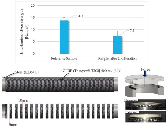 Figure 15 shows the results of a supplementary interlaminar shear test conducted on the produced steel-composite shaft. During demolding of the hybrid shaft produced after the second cleaning cycle, a noticeable resistance was observed, suggesting that internal shear stress may have built up between the metallic and composite layers. To investigate this further, an interlaminar shear strength (ILSS) test was conducted. The molded shaft was sectioned into 20 specimens, each 5 mm wide, and tested using a MTS with a fixture designed to push the metal insert out of the CFRP layer. This setup simulates interfacial stress conditions and allows evaluation of adhesion quality within the hybrid component. The test results revealed a reduction in interlaminar shear strength from 13.9 N/mm