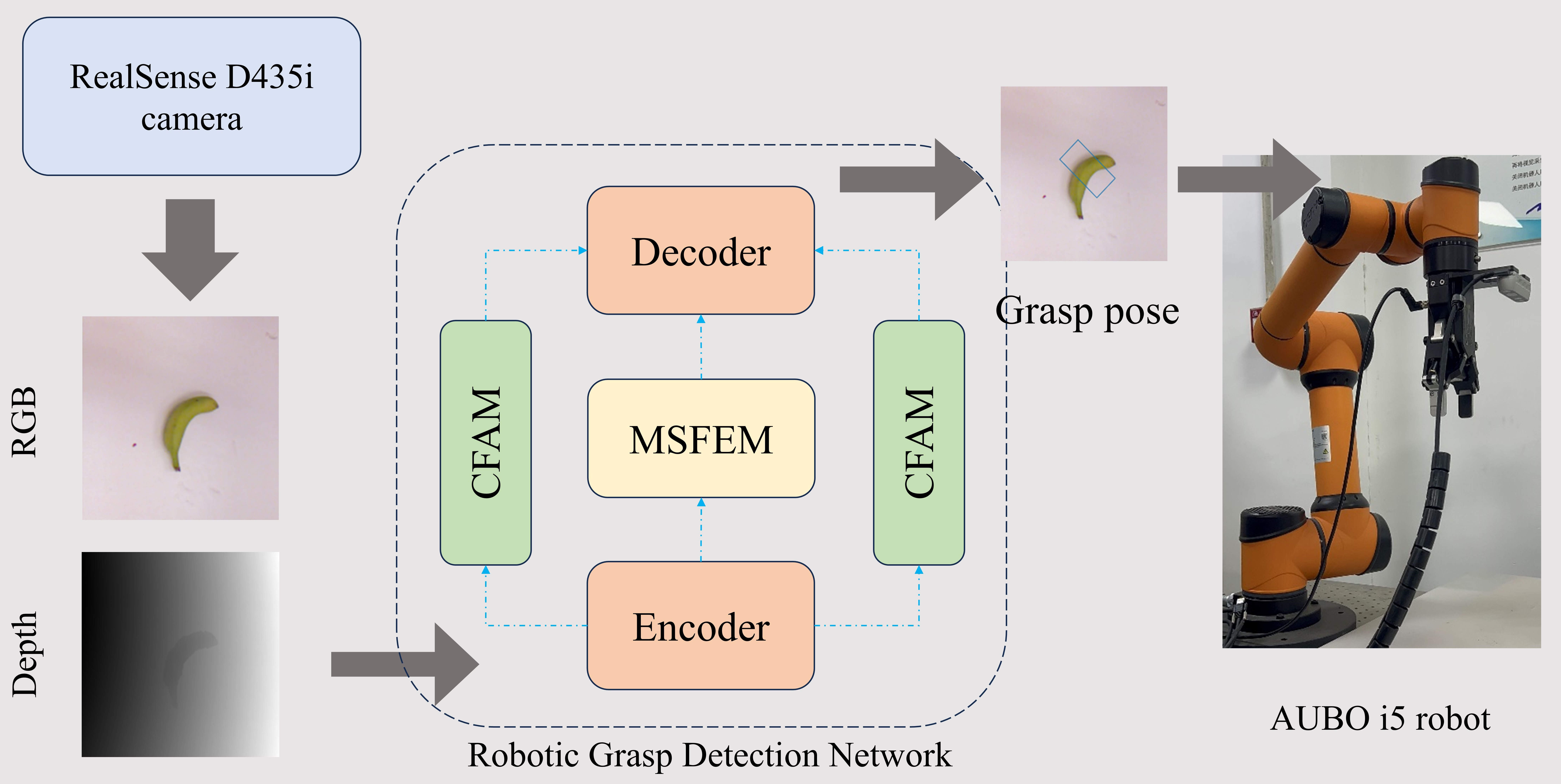 - Extensive experiments on the Cornell and Jacquard datasets, along with real-world deployment on an AUBO i5 robot, demonstrate state-of-the-art accuracy and robust performance in unstructured environments.