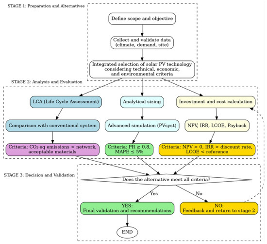 The methodology illustrated in the diagram in Figure 1 is structured into three main stages. The first stage, Preparation and Alternatives, involves defining the scope and objectives of the study, collecting and validating relevant data (such as climate, energy demand, and site characteristics), and selecting the technology and possible alternatives, including panel type, orientation, available area, and inverters. The second stage, Analysis and Evaluation, integrates the calculation of investment and costs, analytical sizing, advanced simulation (using PVsyst), and a life cycle assessment (LCA), as well as comparisons with conventional systems. This stage applies environmental criteria (such as -eq emissions and material acceptability), economic criteria (NPV, IRR, LCOE, and Payback), and technical criteria (performance ratio and mean absolute percentage error, MAPE) to assess the feasibility of each alternative. The third stage, Decision and Validation, involves verifying whether the proposed alternatives meet all established criteria. If so, final validation and recommendations are provided; if not, the process is iteratively refined by returning to the analysis stage. This multidisciplinary and iterative approach ensures a robust, comprehensive evaluation of photovoltaic system options from technical, economic, and environmental perspectives.
