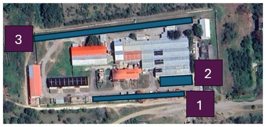 The study area is located at geocoordinates 22.244434° N, −80.407681° W. Figure 2 has favorable solar radiation for the installation of photovoltaic panels, according to meteorological data provided by Meteonorm 7.3 (1991–2005). In addition, several locations have been identified as suitable for the installation of photovoltaic solar systems, with specific perimeter and surface measurements for each area. This enables the assessment of energy potential and the optimization of solar energy utilization within the company. The case study was divided into three regions.