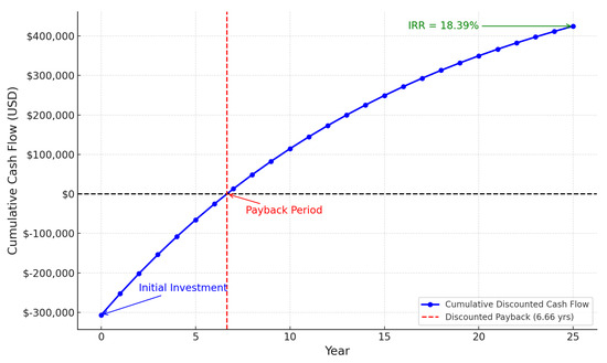 The calculation of the avoided electricity cost is performed considering only the working days of the year. This choice is because in agroindustrial plants, the electrical consumption and production operations are mainly concentrated on business days when industrial activity is ongoing. Therefore, evaluating the photovoltaic system’s contribution only during these days allows for a more accurate and realistic estimate of the economic savings, avoiding an overestimation of benefits by including days such as weekends or holidays when electricity demand is significantly lower or null. The most commonly used economic variables are based on different models established in the scientific literature [48,49], and they are shown in the following equations: