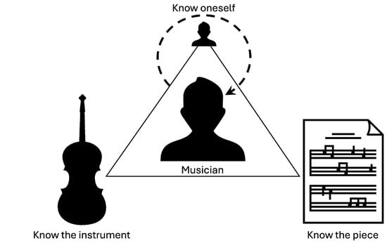 Musical performance, when viewed from the musician’s perspective, is a demanding activity that represents the culmination of years of dedication, study, and practice. In high-profile contexts—such as performances with renowned orchestras, at prestigious venues, and during major festivals—professional musicians are expected, both by their audiences and, perhaps more critically, by themselves, to deliver performances that are not only technically flawless but also highly expressive and authentic. Achieving this level of artistry consistently requires a deep commitment that spans many years and encompasses a wide range of subdisciplines, including music history and theory, harmonic analysis, auditory training, instrumental technique, and both solo and ensemble performance practice [1,2]. In other words, musical performance requires a triad of knowledge (Figure 1): musicians must know the piece (the music), the instrument, and themselves.