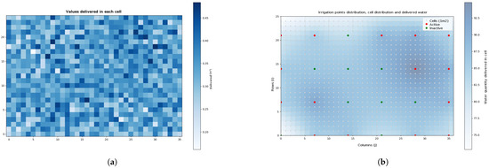 Figure 6a), a quantitative assessment of spatial uniformity may be introduced in future work. Metrics such as the Coefficient of Variation (CV), Distribution Uniformity (DU), and Root Mean Squared Deviation (RMSD) between achieved vs. required soil moisture could be computed for each algorithm. These would offer a more robust comparison of irrigation effectiveness and consistency.