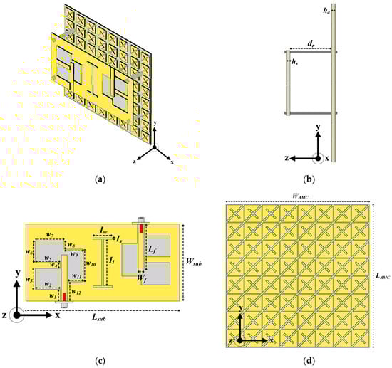 The proposed dual-element wideband CP slot-integrated MIMO antenna with X-notch square AMC: (a) schematic view, (b) side view, (c) upper-layer substrate (MIMO antenna), and (d) lower-layer substrate (reflector).