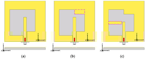 Three layouts of the single-element slot-integrated antenna scheme: (a) first layout, (b) second layout, and (c) third layout.
