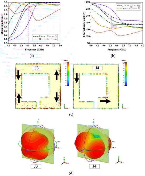 The first layout consists of a square-shaped copper plate (perfect electric conductor) with an asymmetric square-shaped slot on a lossless FR-4 substrate, as shown in Figure 2a. Figure 3a–d depict the CMA results for the first layout of the single-element slot-integrated antenna. Figure 3a presents the MS results for modes J1–J6. At 5.6 GHz, the MS of modes J3 and J4 is 0.88, which is greater than 0.707 and identical. In Figure 3b, the phase difference in CA between modes J3 and J4 at 5.6 GHz is 55°. In Figure 3c, mode J3 exhibits strong current distribution along the outer edge of the slot ground plane, whereas mode J4 demonstrates weak current distribution. Neither mode exhibits current distribution in orthogonal directions.
