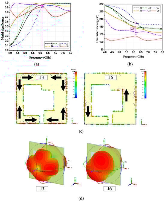 In the second layout, a rectangular-shaped stub is affixed to the right-hand corner of the slot ground plane, as illustrated in Figure 2b. Figure 4a–d illustrate the CMA results for the second layout of the single-element slot-integrated antenna. Figure 4a presents the MS results for modes J1–J6 of the second layout. Affixing a rectangular stub to the slot ground plane alters the two identical modes, resulting in modes J3 and J6. At 6.1 GHz, the MS of modes J3 and J6 is 0.91. The phase difference in CA between modes J3 and J6 at 6.1 GHz is 67°, as shown in Figure 4b. In Figure 4c, the currents of modes J3 and J6 are concentrated near the corners of the outer and inner edges of the slot ground plane, respectively. However, neither mode exhibits current distribution in orthogonal directions.