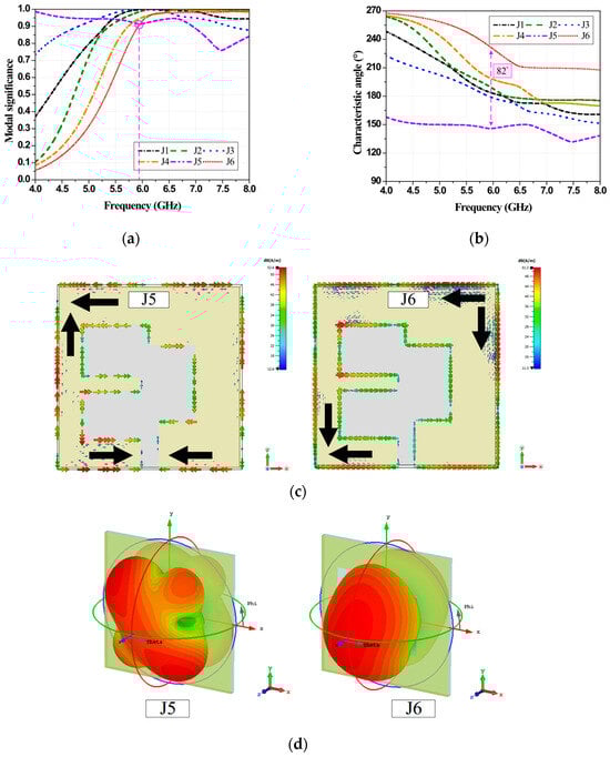 CMA results of the third layout of the single-element slot-integrated antenna scheme: (a) modal significance showing modes J5 and J6 with 0.92 at 5.9 GHz, giving rise to resonant frequency, (b) phase difference of characteristic angle showing modes J5 and J6 with 82°, indicating potential for CP radiation, (c) current distribution showing orthogonal direction, indicating CP radiation, and (d) radiation pattern showing modes J5 and J6 with symmetrical lobes and orthogonality, resulting in CP radiation.