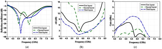 In Figure 6a–c, the simulated RLBW, ARBW, and maximum gain of the first layout cover 4.93–6.68 GHz, 5.56–5.74 GHz, and 2.46 dBic at 5.3 GHz, respectively. The simulated RLBW, ARBW, and maximum gain of the second layout cover 4.63–6.77 GHz, 5.81–6.76 GHz, and 1.38 dBic at 6 GHz, respectively. The simulated RLBW, ARBW, and maximum gain of the third layout cover 4.7–6.95 GHz, 5.19–6.53 GHz, and 3.51 dBic at 5.6 GHz, respectively. The results indicate that the third layout achieves a wide RLBW and ARBW with optimal gain. Table 2 tabulates the comparison results of three layouts, including geometry change, CMA results, RLBW, ARBW, and gain.