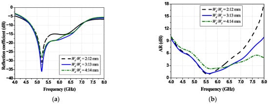 Figure 7a–b show the simulated RLBW and ARBW under different ratios W4:W5: 2:12, 3:13, and 4:14 mm. In Figure 7a, the RLBW for W4:W5 = 3:13 mm and 4:14 mm is nearly identical (4.7–6.95 GHz). In Figure 7b, increasing W4:W5 shifts the ARBW slightly toward higher frequency; the 3:13 mm provides the widest ARBW within the target band. Thus, W4:W5 = 3:13 mm is selected as optimal.