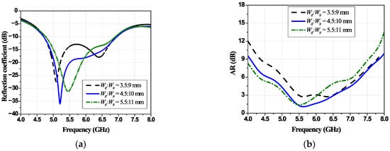 Figure 8a,b show the simulated RLBW and ARBW under different ratios W8:W9: 3.5:9, 4.5:10, and 5.5:11 mm. In Figure 8a, the RLBW remains essentially unchanged for all ratios (4.7–6.95 GHz). As shown in Figure 8b, increasing W8:W9 shifts the ARBW slightly toward lower frequency; the 4.5:10 mm provides the widest ARBW within the target band. Therefore, W8:W9 = 4.5:10 mm is selected as optimal.