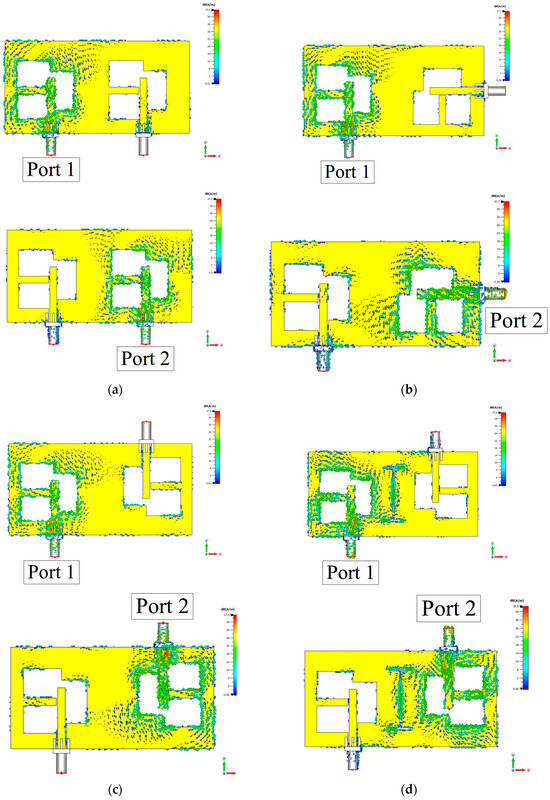 In the parallel configuration, both antenna elements exhibit strongly concentrated current distributions, as shown in Figure 9a. In the orthogonal configuration, the current distribution on element 1 becomes comparatively weaker, while element 2 manifests an intense current concentration between the antenna elements, as illustrated in Figure 9b.