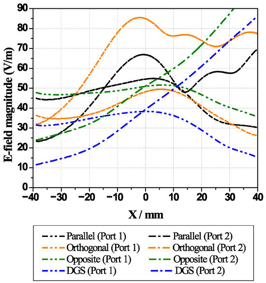 In the parallel configuration, the E-field magnitudes at the center (x = 0 mm) of antenna elements 1 and 2 are 54.56 V/m and 66.83 V/m, respectively, indicating strong coupling. In the orthogonal configuration, the E-field magnitude of element 1 decreases to 48.2 V/m, while that of element 2 increases to 85 V/m. Despite orthogonal excitation, element 2 still exhibits significantly high coupling.
