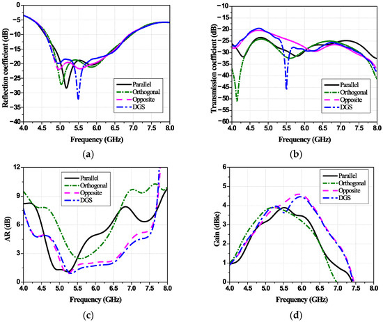 Figure 11a–d illustrate the simulated results of the dual-element antenna scheme for various configurations. In Figure 11a, the simulated RLBW of all configurations spans a similar frequency range (4.95–6.95 GHz). In Figure 11b, the simulated isolation values (|S21|) of the parallel, orthogonal, opposite, and opposite with an I-shaped slot DGS isolator configurations are less than 24.2 dB, 24.6 dB, 21 dB, and 21 dB, respectively. The corresponding simulated ARBW values are 4.7–5.55 GHz, 5.34–5.9 GHz, 4.94–6.7 GHz, and 5–6.77 GHz, as shown in Figure 11c. In Figure 11d, the maximum gains are 3.91 dBic at 5.5 GHz for the parallel configuration, 3.9 dBic at 5.2 GHz for the orthogonal configuration, 4.61 dBic at 5.9 GHz for the opposite configuration, and 4.47 dBic at 6 GHz for the configuration with a DGS isolator.