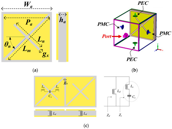Figure 12a–c illustrate the configuration, boundary setup, and equivalent circuit model of an X-notch square elemental unit. In Figure 12a, an asymmetric X-notch square elemental unit is positioned on a 12 mm × 12 mm (Wa × Wa) FR-4 substrate, with a thickness of 1.6 mm (ha), εr of 4.3, and tanδ of 0.025. Each X-notch square elemental unit consists of a square patch with an X-notch slot and a ground plane. The dimension of the square patch is 11 mm × 11 mm (Pa × Pa). The X-notch slot comprises major- and minor-diagonal arms, with dimensions of 15.06 mm × 0.5 mm (Lm × gx) and 5.5 mm × 0.5 mm (Ln × gx), respectively. The minor-diagonal arm is tilted at an angle of 45° (θn).