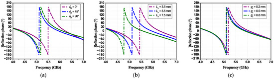 A parametric study is conducted to optimize the reflection phase of the X-notch square elemental unit by varying the tilting angle of the minor-diagonal arm (θn), the length of the minor-diagonal arm (Ln), and the width of the diagonal arm (gx). Figure 13a–c illustrate the simulated reflection phase of the X-notch square elemental unit for various θn, Ln, and gx, respectively.