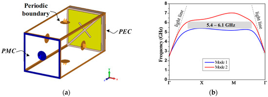 As shown in Figure 14a, periodic boundary conditions are applied to the ±x and ±y axes to define the boundary conditions of the dispersion diagram. The PMC and PEC are assigned to the +z and -z axes, respectively. In Figure 14b, the suppressed bandgap is observed between modes 1 (TM mode) and 2 (TE mode), spanning 5.4–6.1 GHz, indicating that the bandgap suppresses surface waves within this frequency range [32].