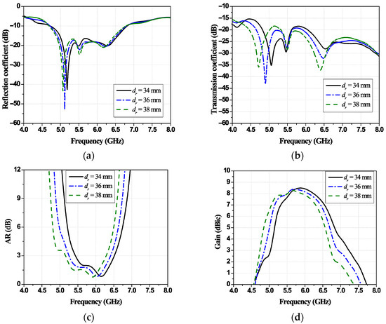 Figure 15a–d illustrate the simulated RLBW, isolation, ARBW, and gain for different distances between the proposed antenna and the AMC (dr): 34, 36, and 38 mm. In Figure 15a, the simulated RLBW of the antenna scheme spans 4.7–6.8 GHz, with simulated isolation values greater than 17 dB, 19 dB, and 18.4 dB for dr of 34, 36, and 38 mm, respectively, as shown in Figure 15b. Figure 15c presents the simulated ARBW of 5.43–6.51 GHz, 5.25–6.41 GHz, and 5.15–6.2 GHz, with corresponding maximum gains of 8.4 dBic at 5.9 GHz, 8.42 dBic at 5.7 GHz, and 8.32 dBic at 5.6 GHz, as shown in Figure 15d. At dr = 36 mm, the proposed antenna scheme achieves wide RLBW and ARBW along with high isolation. The optimal value of dr is 36 mm.