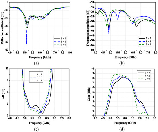 Figure 16a–d illustrate the simulated RLBW, isolation, ARBW, and gain for different numbers of X-notch square elemental units: 7 × 7, 8 × 8, and 9 × 9. In Figure 16a, the simulated RLBW values are 4.74–6.8 GHz, 4.7–6.8 GHz, and 4.76–6.8 GHz, respectively, with simulated isolation exceeding 18.2 dB, 19 dB, and 17.7 dB, as shown in Figure 16b. Figure 16c presents the simulated ARBW of 5.28–6.5 GHz, 5.25–6.41 GHz, and 5.17–6.31 GHz, with corresponding maximum gains of 8.23 dBic at 5.9 GHz, 8.42 dBic at 5.7 GHz, and 8.8 dBic at 5.4 GHz, as shown in Figure 16d. The proposed antenna scheme achieves wide bandwidth and high isolation with 8 × 8 X-notch square elemental units. Consequently, the optimal number of AMC elemental units is 8 × 8.