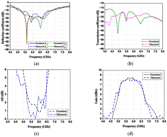 Figure 18a–d illustrate the simulated and measured results of the proposed dual-element CP slot-integrated MIMO antenna with an X-notch square AMC. In Figure 18a, the simulated and measured RLBW (|S11| and |S22| ≤ −10 dB) span 4.7–6.8 GHz and 4.72–6.61 GHz, respectively. The simulated and measured isolation values (|S21|) exceed 19 dB, as shown in Figure 18b. In Figure 18c, the simulated and measured ARBW (AR ≤ 3 dB) are 5.25–6.41 GHz and 5.2–6.45 GHz, respectively, with corresponding maximum gains of 8.42 dBic at 5.7 GHz and 8.6 dBic at 5.9 GHz, as shown in Figure 18d.