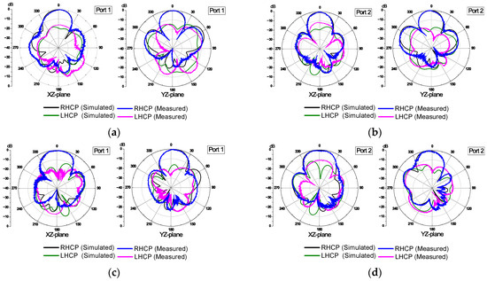 Figure 19a–d illustrate the simulated and measured XZ- and YZ-plane radiation patterns for antenna elements 1 and 2 of the proposed antenna scheme at 5.4 GHz and 5.9 GHz. The simulated and measured results of both elements show good agreement.