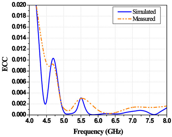 where and represent the electric-field vectors of elements 1 and 2, respectively, and Ω denotes the solid angle. As shown in Figure 20, the simulated and measured ECC of the proposed dual-element antenna scheme remains below 0.003 across the ARBW.